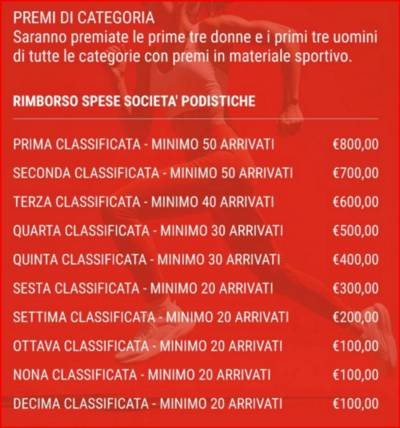 I premi in denaro verranno consegnati entro il 90 giorni. Premiate le società con un numero di arrivati di almeno 15 atleti.