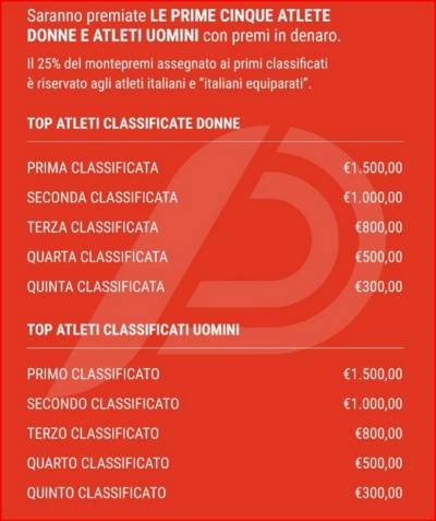 Il 25% del montepremi effettivamente assegnato ai primi classificati è riservato agli atleti italiani e “italiani equiparati” ed è cumulabile con i premi assegnati per posizione di classifica.