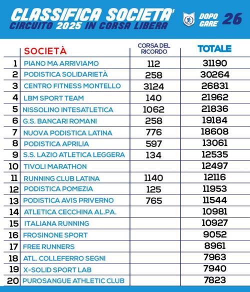 La prossima tappa in calendario è la Mezza Maratona di Latina e si proseguirà poi con un programma ricco e variegato. Un plauso a tutti i presidenti ed organizzatori che investono con coraggio e dedizione nella corsa, mantenendo vive tradizioni e cultura del settore podistico. Buone corse a tutti – conclude Fioriello – per un 2025 ricco di emozioni da condividere”.
