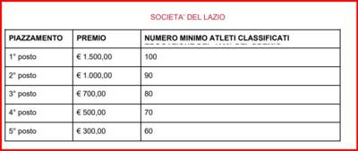 Le società classificate percepiranno il premio in denaro in proporzione al numero di arrivati. Il premio viene assegnato interamente se il numero di atleti classificati è uguale o superiore ai minimi indicati nella tabella sottostante, per ciascuna posizione della graduatoria.