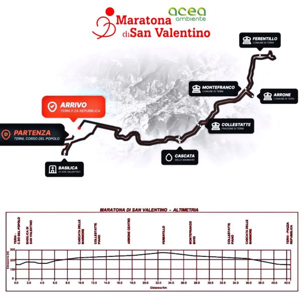 Subito dopo le cascate è posizionato il giro di boa della mezza maratona mentre per coloro che affronteranno la distanza regina si prosegue attraversando Arrone fino a raggiungere Ferentillo, da dove dopo aver attraversato l'abitato si tornerà verso Terni, con una pendenza tutta a favore fino a raggiungere l'ambizioso traguardo in piazza Repubblica per andare a prendere la meritatissima medaglia a forma di cuore.