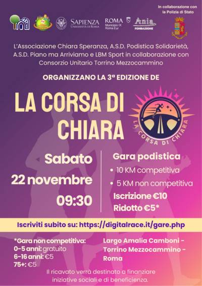 Dopo il successo della seconda edizione del dicembre 2024, “La Corsa di Chiara” si conferma un appuntamento di sport, memoria e impegno civile. L’organizzazione ha già ottenuto i patrocini di Università La Sapienza di Roma, Fondazione Ania e Consorzio Torrino Mezzocammino e la collaborazione con la polizia stradale.