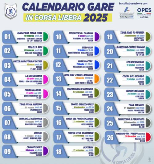 “Il Circuito In Corsa Libera si conferma il più importante e partecipato nel panorama laziale – commenta Davide Fioriello presidente della asd In Corsa Libera – Anche quest’anno, il calendario gare accoglie corse e trail molto apprezzati e crea una preziosa rotta per le società sportive locali, promuovendo non solo la competizione stessa, ma anche i territori di svolgimento.