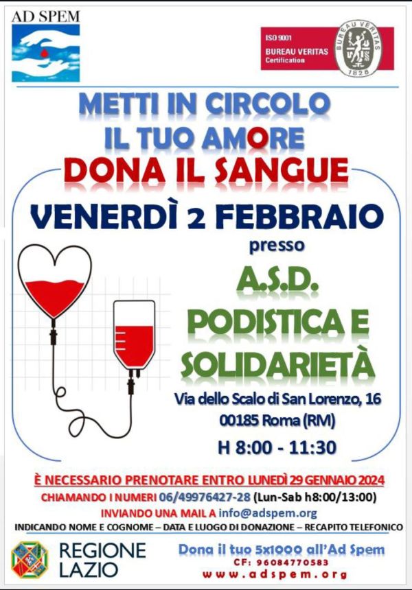 Venerdì 2 febbraio fai una buona azione: vieni a donare il sangue!!! di Redazione Podistica, 08/01/2024