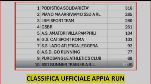 Ecco la classifica di società della XXVI Roma Appia Run.