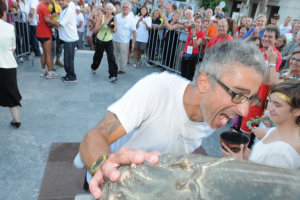 Questo è il momento più bello di tutta la gara, non lo scorderò mai, la via è piena di gente che mi urla, mi applaude mi incita dalla strada e dai balconi, molti mi vengono vicino e mi danno pacche di incoraggiamento, io intanto vedo la statua di re Leonida, è lì che mi aspetta (dicono che ci fosse pure la musica ma io non la ricordo!), pochi passi ancora, salgo i pochi gradini che mi separano da Leonida e urlo “ce la faccio, questa è Sparta!”: tocco il piede della statua, è finita, mi mettono una corona di rami e foglie in testa, mi danno una placca simbolo della gara e mi fanno bere, come da tradizione, da una coppa portata da una giovane spartana e che contiene l’acqua sacra del fiume che scorre lì accanto.
