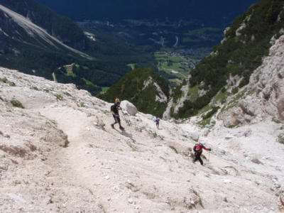 Il percorso, allungato a 90 km (in precedenza era di 60 km) è molto tecnico, con lunghi passaggio esposti su ghiaia, molti guadi di varie dimensioni e, soprattutto, con pendenze positive/negative davvero da brivido. Forse l’allungamento a 90 km è un po’ eccessivo e le indicazioni date agli atleti, circa il livello di difficoltà di questo ultimo, scarse a volte contraddittorie. Infatti, dal 65 km e fino all’arrivo, si sino succeduti, nell’ordine: 4 km di sterratone pietroso ricavato nel fondovalle, 4 km di salita pesantissima nel bosco su single track, poi ancora 3 km di saliscendi continuo a mezza costa e, infine 12 km di strada sterrata molto pendente, che ci ha condotto fino ad Auronzo, con un ultimo pezzo di circa 3 km talmente pendente che per rallentare un po’ dovevamo abbracciare..gli alberi nelle curve.