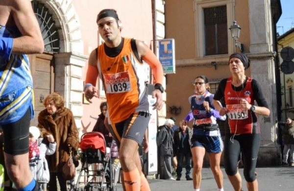 Una salita abbastanza ripida porta gli atleti ad attraversare la cittadina viterbese e un tratto a doppio senso permette di incrociare gli atleti che ti precedono mentre si è impegnati nella salita e quelli che ti seguono mentre stai riscendendo. Poche centinaia di metri in cui i reciproci incoraggiamenti e i "give me five” lanciati lungo le transenne e il nastro biancorosso di separazione ti fanno dimenticare per un po’ la stanchezza e la durezza della gara e ti danno lo slancio necessario a continuare. Così per me è un piacere incrociare con lo sguardo i miei amici Eleonora Mella, Alessandro Argentieri, Tamara Arias e Pietro Paolo Giuri che mi precedono.